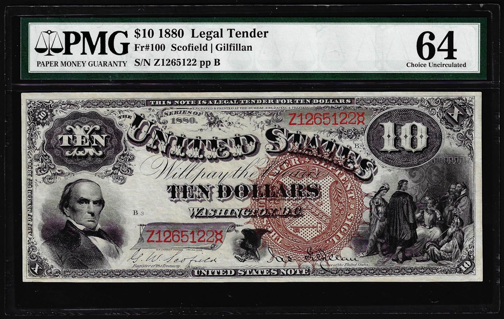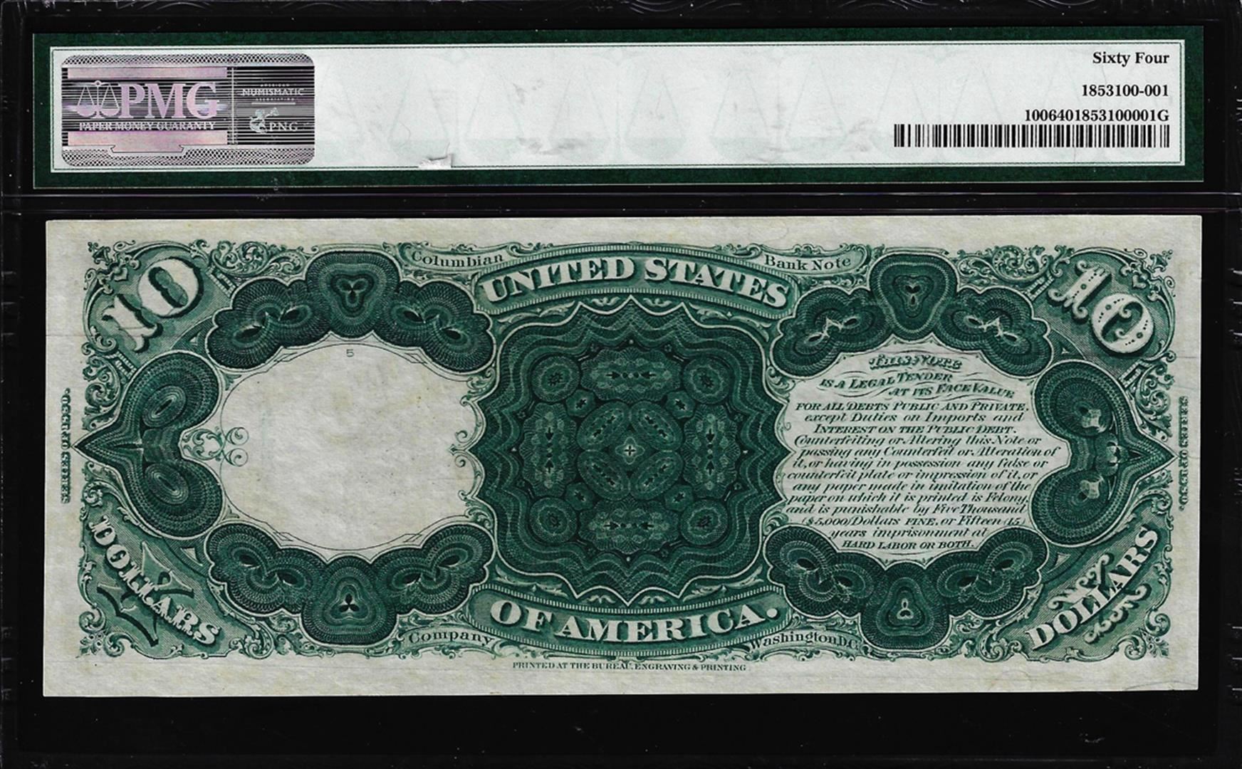 One 1880 $10 Jackass Legal Tender Note Fr.100 PMG Choice Uncirculated 64. PMG Certified.