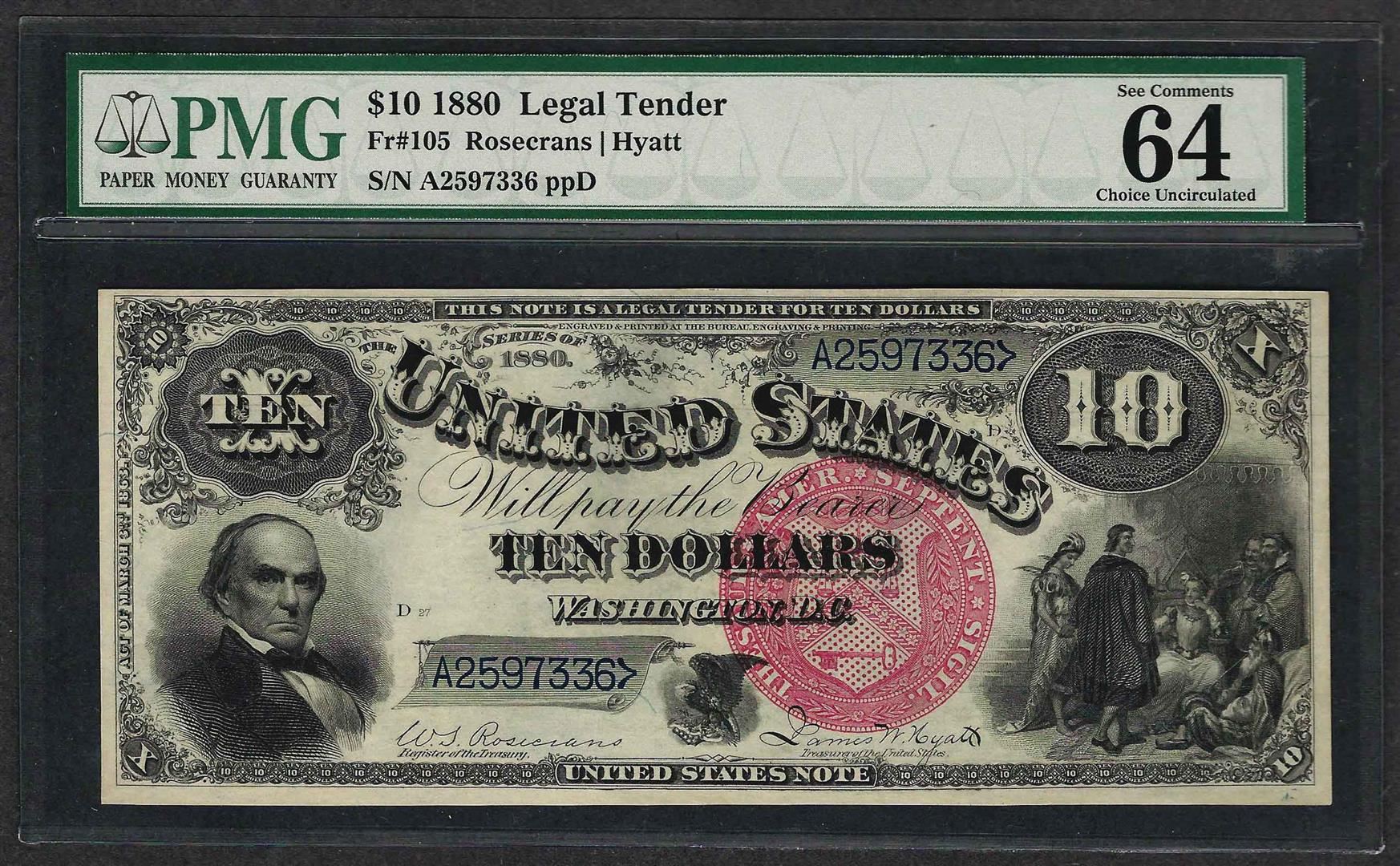 One 1880 $10 Jackass Legal Tender Note Fr.105 PMG Choice Uncirculated 64. PMG Certified.