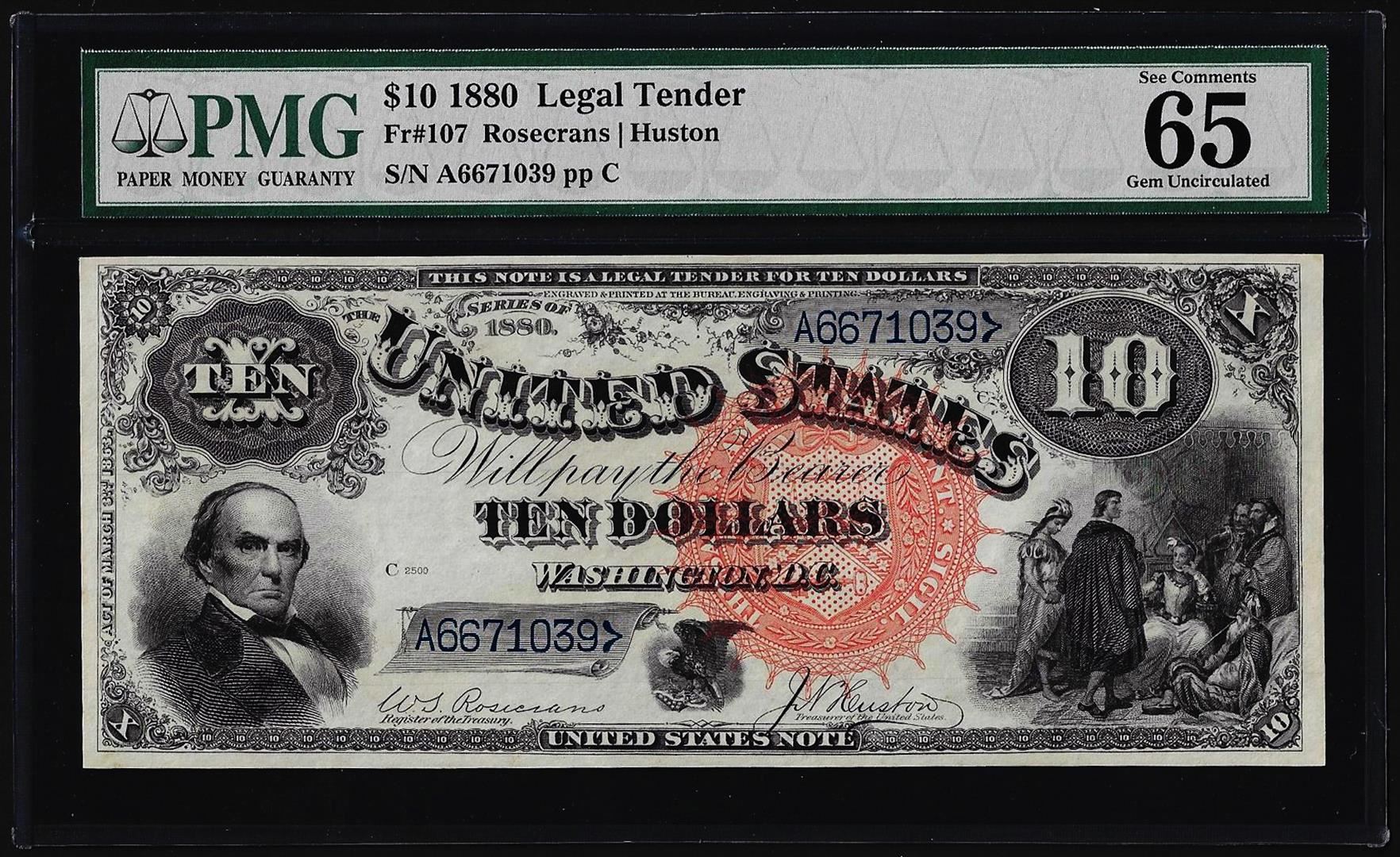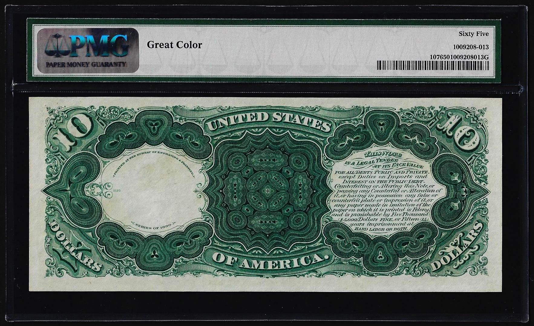 One 1880 $10 Jackass Legal Tender Note Fr.107 PMG Gem Uncirculated 65 Great Color. PMG Certified.