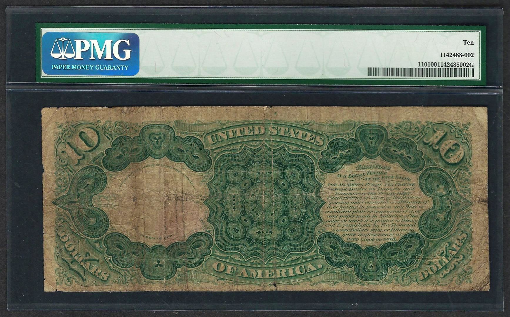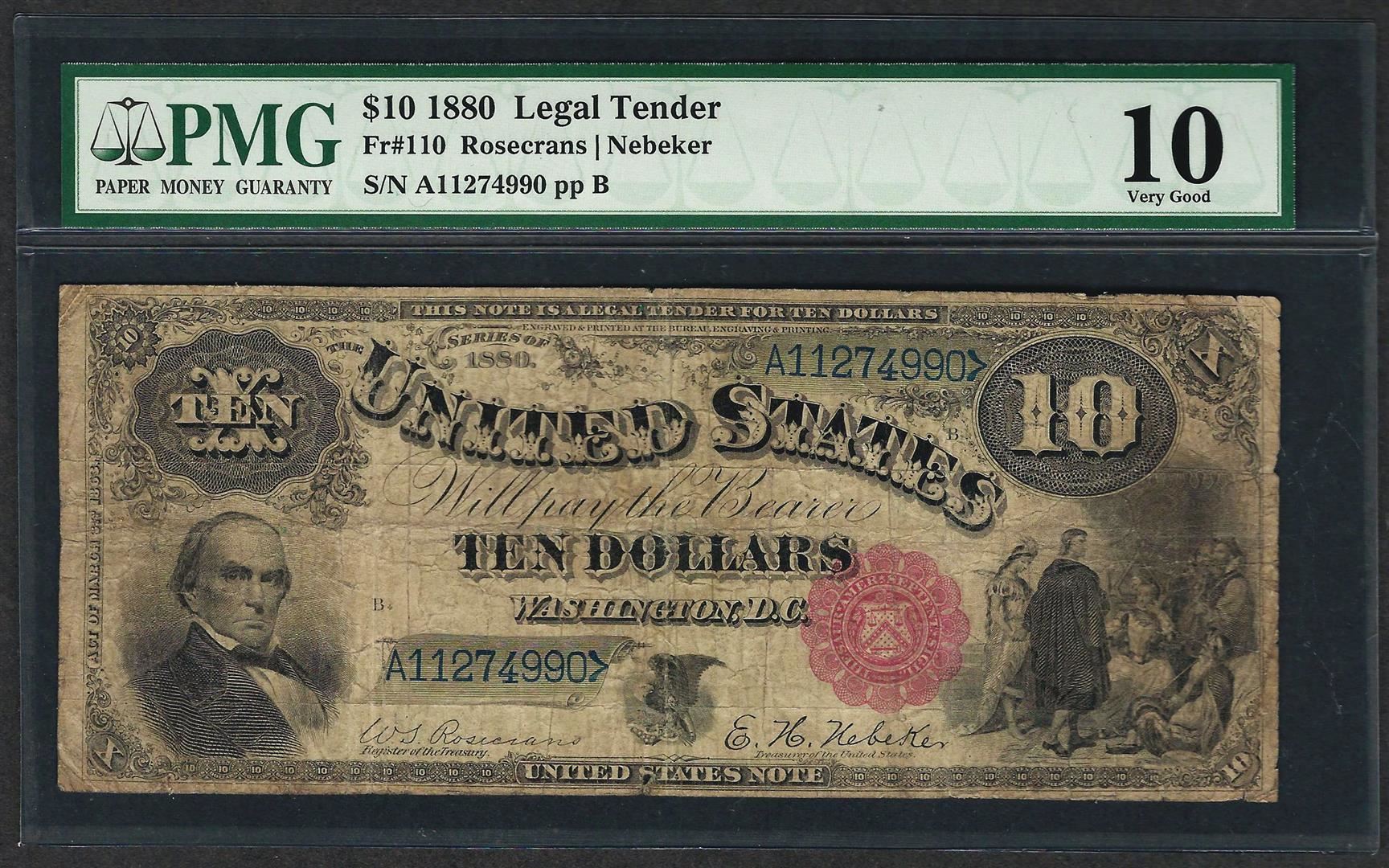 One 1880 $10 Jackass Legal Tender Note Fr.110 PMG Very Good 10. PMG Certified.