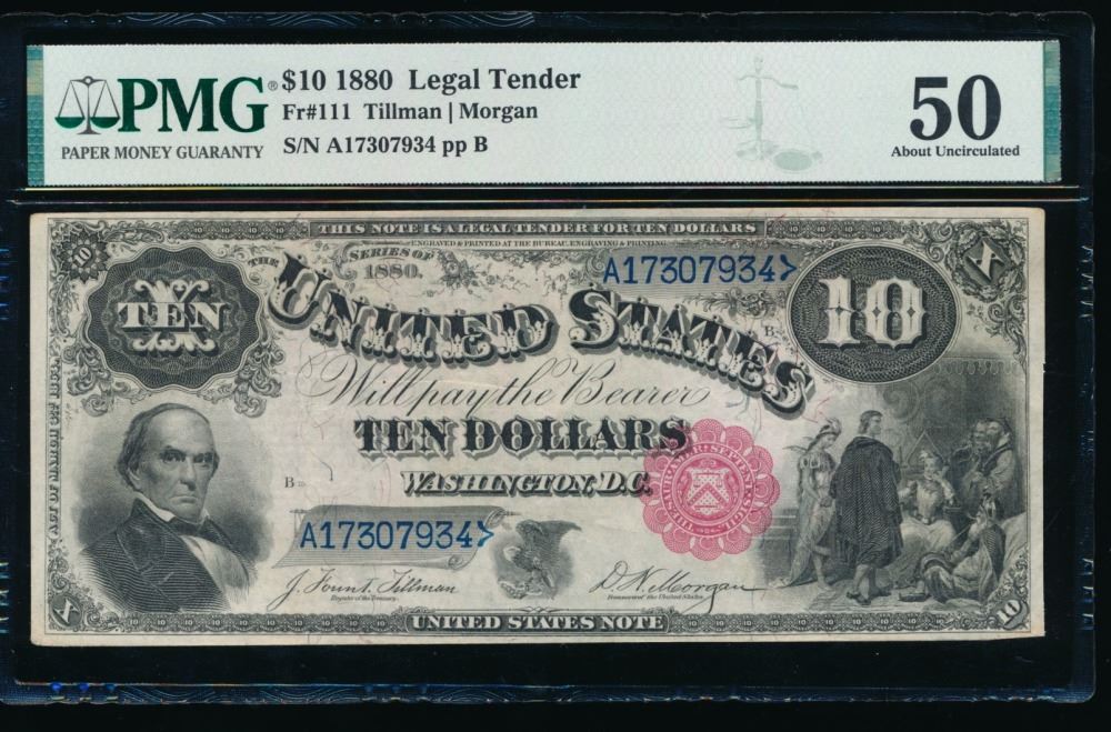 One 1880 $10 Jackass Legal Tender Note PMG 50.