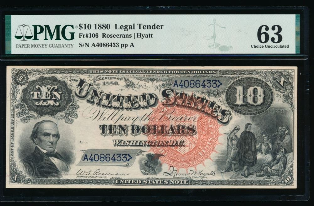 One 1880 $10 Jackass Legal Tender Note PMG 63.