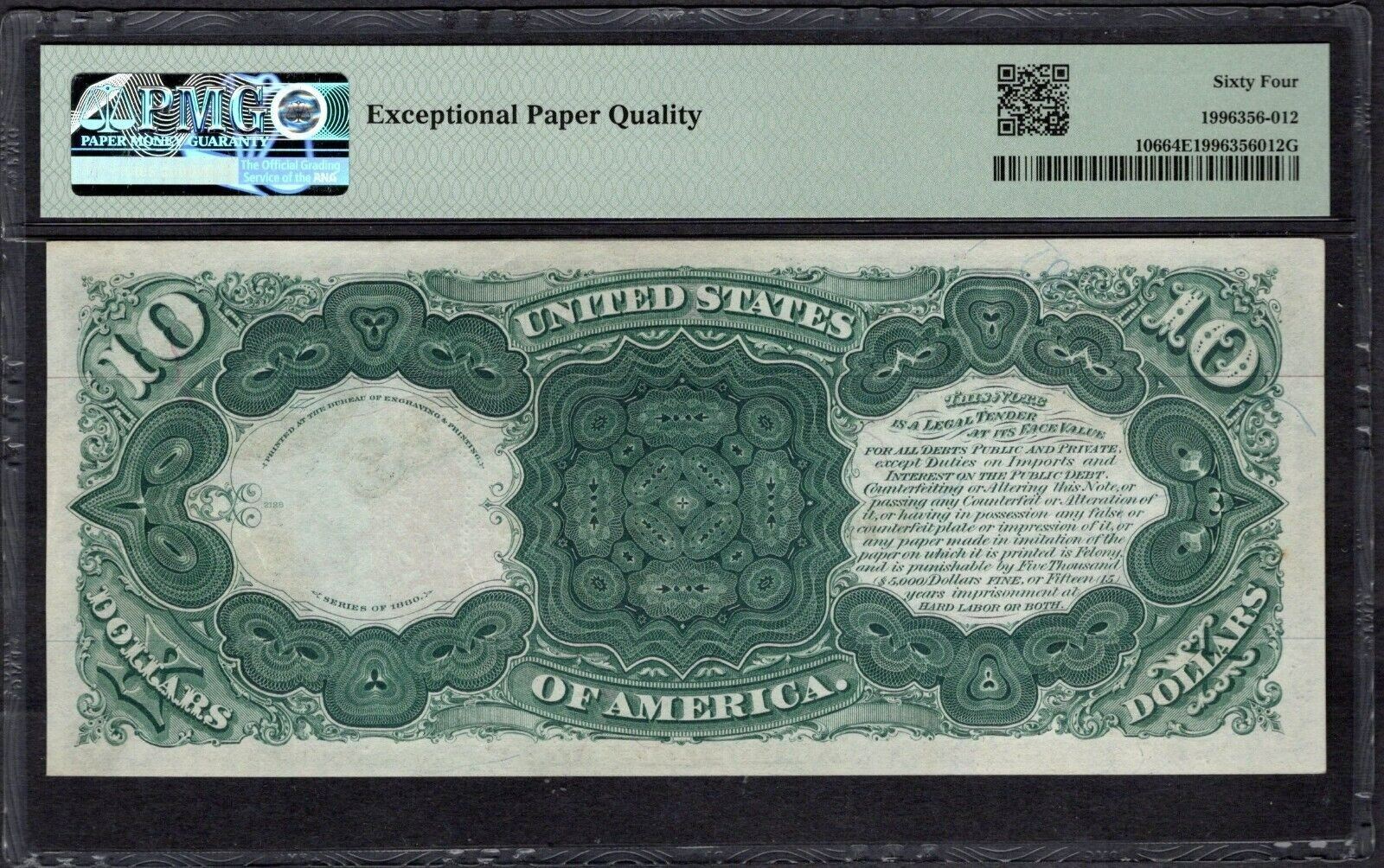 One 1880 $10 Jackass Legal Tender Note PMG 64EPQ.