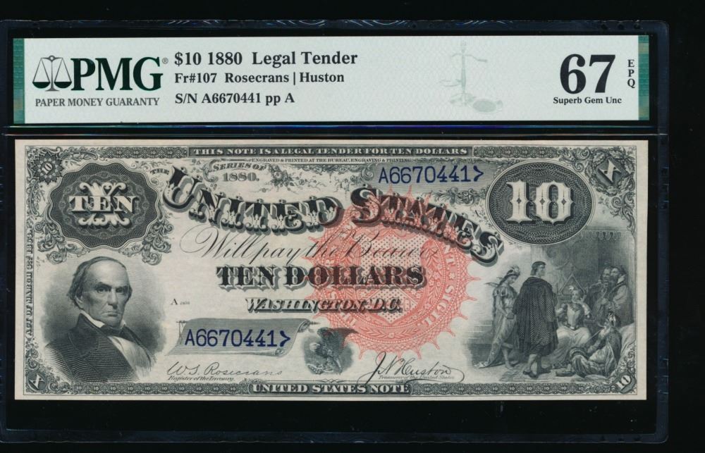 One 1880 $10 Jackass Legal Tender Note PMG 67EPQ.
