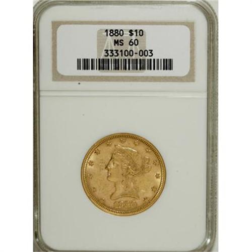 <B>1880 $10 MS60 NGC.</B></I> NGC Census: (217/895). PCGS Population (144/424). Mintage: 1,644,876. Numismedia Wsl. Price for NGC/PCGS coin in MS60: $408. (#8687)<BR><BR><B>Coin Engraver:</B> Christian Gobrecht<BR><BR><b>Shipping:</b> Coins & Currency (<a target="_blank" href="http://www.heritageauctions.com/common/shipping.php">view shipping information</a>)