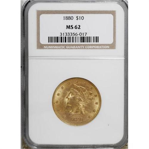 <B>1880 $10 MS62 NGC.</B></I> . NGC Census: (284/34). PCGS Population (244/62). Mintage: 1,644,876. Numismedia Wsl. Price for NGC/PCGS coin in MS62: $530. (#8687)<BR><BR><B>Coin Engraver:</B> Christian Gobrecht<BR><BR><b>Shipping:</b> Coins & Currency (<a target="_blank" href="http://www.heritageauctions.com/common/shipping.php">view shipping information</a>)
