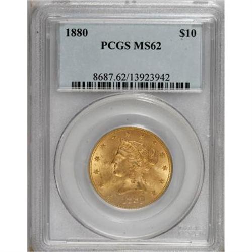 <B>1880 $10 MS62 PCGS.</B></I> PCGS Population (230/62). NGC Census: (274/34). Mintage: 1,644,876. Numismedia Wsl. Price for NGC/PCGS coin in MS62: $500. (#8687)<BR><BR><B>Coin Engraver:</B> Christian Gobrecht<BR><BR><b>Shipping:</b> Coins & Currency (<a target="_blank" href="http://www.heritageauctions.com/common/shipping.php">view shipping information</a>)