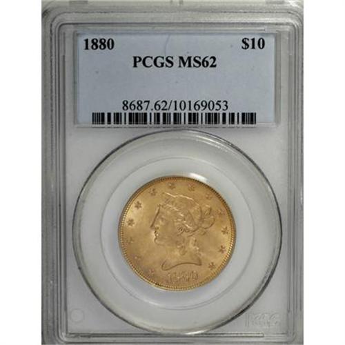 <B>1880 $10 MS62 PCGS.</B></I> . PCGS Population (244/62). NGC Census: (283/34). Mintage: 1,644,876. Numismedia Wsl. Price for NGC/PCGS coin in MS62: $530. (#8687)<BR><BR><B>Coin Engraver:</B> Christian Gobrecht<BR><BR><b>Shipping:</b> Coins & Currency (<a target="_blank" href="http://www.heritageauctions.com/common/shipping.php">view shipping information</a>)