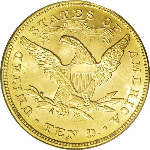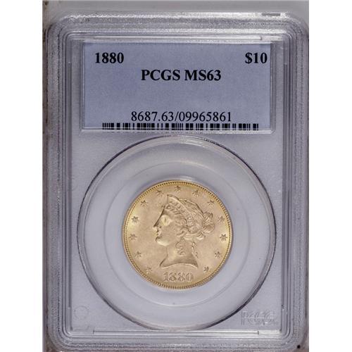 <B>1880<$10> MS63 PCGS.</B></I> Well struck and lustrous with a copper-golden finish overall. The obverse field has a few light luster grazes, but nonetheless a pleasing eagle with considerable eye appeal. The 1880 issue is the earliest in the series that has a mintage above one million pieces, but survivors tend to be much more bagmarked than is the present example. Population: 36 in 63, 7 finer (1/06).