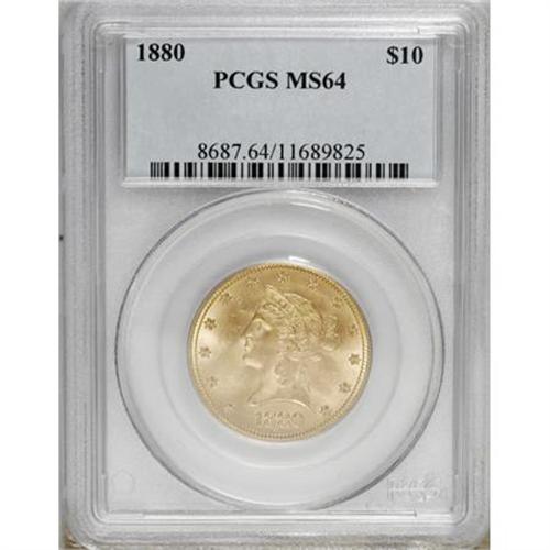 <B>1880 $10 MS64 PCGS.</B></I> This decisively struck and lustrous Liberty ten is from a generous mintage of 1,644,840 pieces, but there was little contemporary interest in the series because of its high face value. As a result, the 1880 is common is scuffy Mint State, but is rare as a near-Gem. Population: 12 in 64, 0 finer (11/07).<BR><BR><B>Coin Engraver:</B> Christian Gobrecht<BR><BR><b>Shipping:</b> Coins & Currency (<a target="_blank" href="http://www.heritageauctions.com/common/shipping.php">view shipping information</a>)