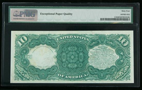 1880, $10 United States Note. PMG Choice Uncirculated 64EPQ. . Fr-113. Unmistakable originality, bold colors, and bright paper combine to give this "Jackass" $10 wonderful eye appeal for the assigned grade. This design type is so-called because of the eagle at the bottom center of the face design, which morphs into a donkey when the note is held upside down.