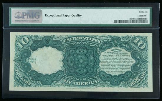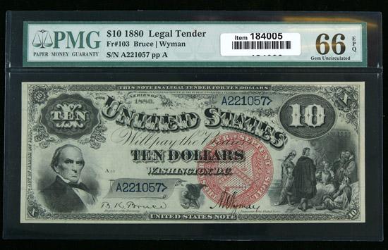 1880, $10 United States Note. PMG Gem Uncirculated 66EPQ. . Fr-103. This "Jackass" possesses excellent colors and great eye appeal that is commensurate with the assigned grade. The margins are ample, and the embossing that is evident through the holder is fully original.