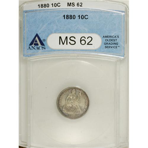 <B>1880 10C MS62 ANACS.</B></I> Greer-103. The pendant is over the center of the second 8. The tiny mintage of 37,355 business strikes makes this piece elusive in Mint State. Light silver-gold patina covers each side, but a few field hairlines prevent a finer grade. A nice coin regardless.<BR><I>Ex: The Lee Collection and the Peter L. Shaffer Collection (Superior Galleries, 9/1988), lot 2571; Stack's 71st Anniversary Sale (10/2006), lot 2679.</B></I><BR><BR><b>Shipping:</b> Coins & Currency (<a target="_blank" href="http://www.heritageauctions.com/common/shipping.php">view shipping information</a>)