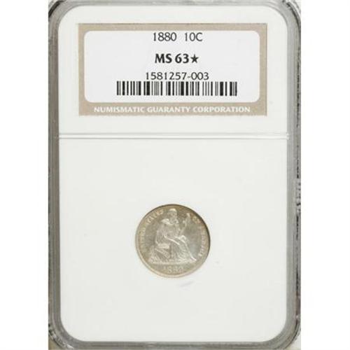 <B>1880 10C MS63</B></I><img src="/images/star.gif" width="10" height="10" alt="" border="0"><B> NGC.</B></I> NGC Census: (9/88). PCGS Population (20/84). Mintage: 36,000. Numismedia Wsl. Price for NGC/PCGS coin in MS63: $479. (#4688)<BR><BR><B>Coin Engraver:</B> Christian Gobrecht<BR><BR><b>Shipping:</b> Coins & Currency (<a target="_blank" href="http://www.heritageauctions.com/common/shipping.php">view shipping information</a>)