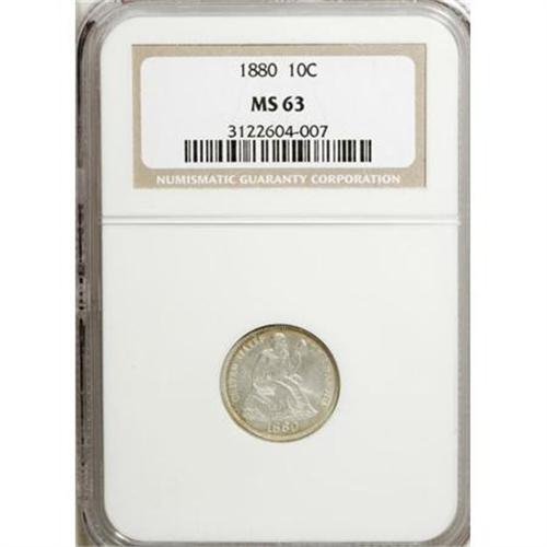 <B>1880 10C MS63 NGC.</B></I> NGC Census: (10/88). PCGS Population (20/84). Mintage: 36,000. Numismedia Wsl. Price for NGC/PCGS coin in MS63: $479. (#4688)<BR><BR><B>Coin Engraver:</B> Christian Gobrecht<BR><BR><b>Shipping:</b> Coins & Currency (<a target="_blank" href="http://www.heritageauctions.com/common/shipping.php">view shipping information</a>)