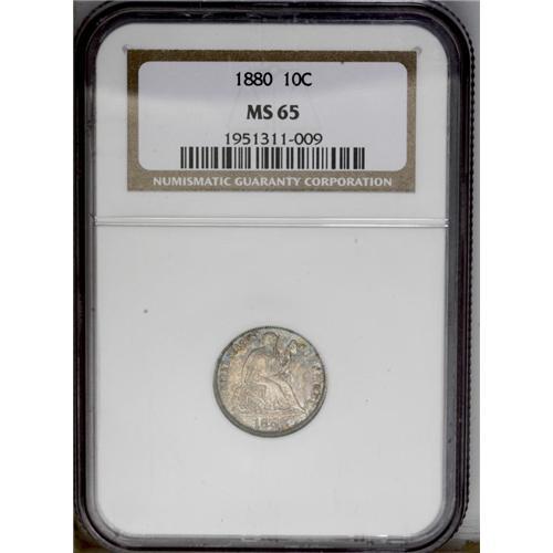 1880 10C MS65 NGC. Sharply detailed under mottled blue 1880[10C] MS65 NGC.