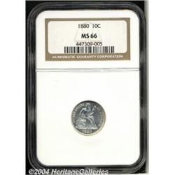 <B>1880<10C> MS66 NGC.</B></I> Although the business strike mintage for this year was limited to 36,000 pieces, quite a few coins were hoarded at the time of issue. Consequently, Uncirculated 1880 Dimes are more obtainable than the average collector might expect. Few, however, could match the technical merits of this sharp, snowy-white Gem. The strike is razor sharp and an intense, satiny sheen permeates both sides. Population: 29 in 66, 9 finer (7/04). <BR><BR><B>Important notice:</B> Heritage usually auctions material at the rate of 200-250 lots per hour. On some occasions eBay Live bid software or the Internet may not be able to keep up with the pace of the auction. We recommend placing a realistic absentee bid now as insurance to avoid disappointment. Occasionally the auctioneer may eliminate or reject an eBay Live bid, and the auctioneer may also reopen a lot after the close of the eBay live bidding (usually because we missed an audience bid), and may reject your bid even if it shows you as the winning bidder. By bidding via eBay Live, you agree that Heritage may award the lot to another bidder at its sole discretion under the circumstances described above or any other reasonable circumstances. Since eBay bids are not shown to us until we open the lot on the floor, we treat those bids just like floor bids. In most cases the floor responds before the eBay bid is presented to us, due to Internet lag time, so for consistency we have made it a policy that floor bids are always considered first over tie eBay live bids. Also please note that all Heritage lots purchased through eBay Live carry a 20% Buyer's Premium. Please make sure you read the Terms and Conditions before you bid. </span></font></tr></table></td></tr></table>