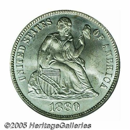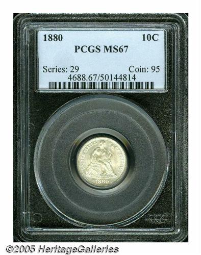 <B>1880<10C> MS67 PCGS.</B></I> Like the similarly dated Quarter and Half Dollar, the 1880 Seated Dime saw only token business strike production. Offered here is another Superb, untoned representative, a predictably sharp coin with radiant, satiny luster. Population: 11 in 67, 0 finer (4/05).
