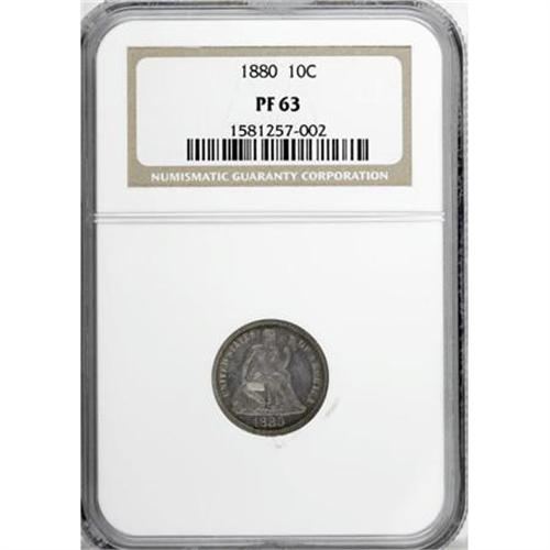 <B>1880 10C PR63 NGC.</B></I> NGC Census: (40/160). PCGS Population (63/152). Mintage: 1,355. Numismedia Wsl. Price for NGC/PCGS coin in PR63: $442. (#4777)<BR><BR><B>Coin Engraver:</B> Christian Gobrecht<BR><BR><b>Shipping:</b> Coins & Currency (<a target="_blank" href="http://www.heritageauctions.com/common/shipping.php">view shipping information</a>)
