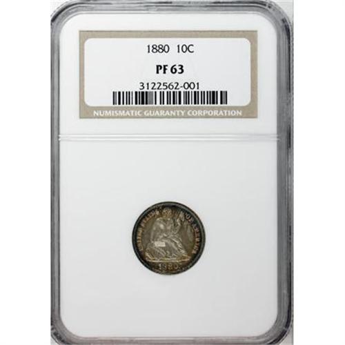 <B>1880 10C PR63 NGC.</B></I> NGC Census: (42/161). PCGS Population (63/152). Mintage: 1,355. Numismedia Wsl. Price for NGC/PCGS coin in PR63: $442. (#4777)<BR><BR><B>Coin Engraver:</B> Christian Gobrecht<BR><BR><b>Shipping:</b> Coins & Currency (<a target="_blank" href="http://www.heritageauctions.com/common/shipping.php">view shipping information</a>)