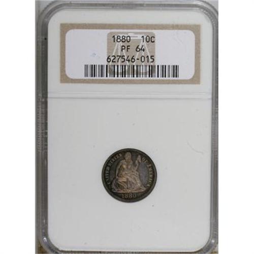 <B>1880 10C PR64 NGC.</B></I> NGC Census: (65/95). PCGS Population (73/78). Mintage: 1,355. Numismedia Wsl. Price for NGC/PCGS coin in PR64: $525. (#4777)<BR><BR><B>Coin Engraver:</B> Christian Gobrecht<BR><BR><b>Shipping:</b> Coins & Currency (<a target="_blank" href="http://www.heritageauctions.com/common/shipping.php">view shipping information</a>)