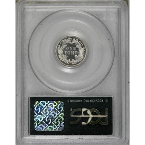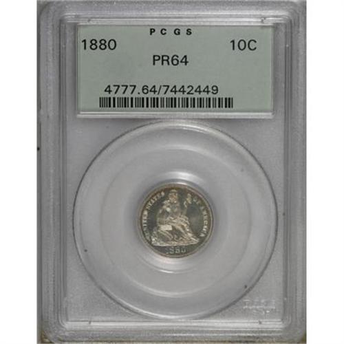 <B>1880 10C PR64 PCGS.</B></I> The obverse has light gold toning, and the reverse is brilliant. Both sides exhibit cameo contrast, although this feature is undesignated on the holder's green label. A low mintage date, since the Philadelphia Mint was consumed by silver dollar production.<BR><BR><B>Coin Engraver:</B> Christian Gobrecht<BR><BR><b>Shipping:</b> Coins & Currency (<a target="_blank" href="http://www.heritageauctions.com/common/shipping.php">view shipping information</a>)