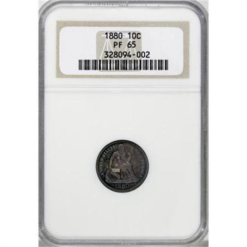 <B>1880 10C PR65 NGC.</B></I> With a mintage of 1,355 pieces, the 1880 ranks as one of the most available proof Seated dime issues. This Gem exemplar is decisively struck with subtle luminosity beneath rich blue, violet, and mint patina. Census: 47 in 65, 49 finer (10/07).<BR><BR><B>Coin Engraver:</B> Christian Gobrecht<BR><BR><b>Shipping:</b> Coins & Currency (<a target="_blank" href="http://www.heritageauctions.com/common/shipping.php">view shipping information</a>)