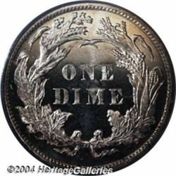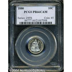 <B>1880<10C> PR66 Cameo PCGS.</B></I> Only 36,000 business strikes were produced in this year, and proofs are much more available for the date collector. This appears to be a completely original coin. Both sides are essentially brilliant, with a faint speckling of russet color at the upper left portion of the obverse. As a future identifier, remnants of a fingerprint are seen on the reverse as the coin is rotated under a light source. Population: 3 in 66 Cameo, 3 finer (7/04). <BR><BR><B>Important notice:</B> Heritage usually auctions material at the rate of 200-250 lots per hour. On some occasions eBay Live bid software or the Internet may not be able to keep up with the pace of the auction. We recommend placing a realistic absentee bid now as insurance to avoid disappointment. Occasionally the auctioneer may eliminate or reject an eBay Live bid, and the auctioneer may also reopen a lot after the close of the eBay live bidding (usually because we missed an audience bid), and may reject your bid even if it shows you as the winning bidder. By bidding via eBay Live, you agree that Heritage may award the lot to another bidder at its sole discretion under the circumstances described above or any other reasonable circumstances. Since eBay bids are not shown to us until we open the lot on the floor, we treat those bids just like floor bids. In most cases the floor responds before the eBay bid is presented to us, due to Internet lag time, so for consistency we have made it a policy that floor bids are always considered first over tie eBay live bids. Also please note that all Heritage lots purchased through eBay Live carry a 20% Buyer's Premium. Please make sure you read the Terms and Conditions before you bid. </span></font></tr></table></td></tr></table>