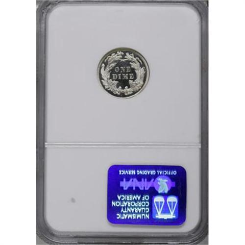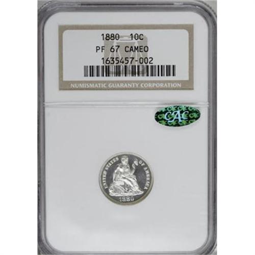 <B>1880 10C PR67 Cameo NGC. CAC.</B></I> Fortin-101. The business-strike 1880 Seated dime is a key coin in all grades, putting added pressure on the proofs made during the year. This piece offers marvelous, untoned silver-white surfaces with much contrast and generous eye appeal. Some of the deep folds of Liberty's gown are brilliant rather than frosty, from die overpolishing. The second loop of the 8 is broken at the bottom, a characteristic of this die pairing. On the reverse a small, triangular die chip is noted on the right upright of the M in DIME, and a tiny dark spot is noted on the left half of that letter. Nonetheless a lovely, rare, and interesting piece of this elusive issue. NGC has certified 12 PR67 Cameos, with a single piece finer (1/08).<BR><I>From The Southwest Collection.</B></I><BR><BR><b>Shipping:</b> Coins & Currency (<a target="_blank" href="http://www.heritageauctions.com/common/shipping.php">view shipping information</a>)