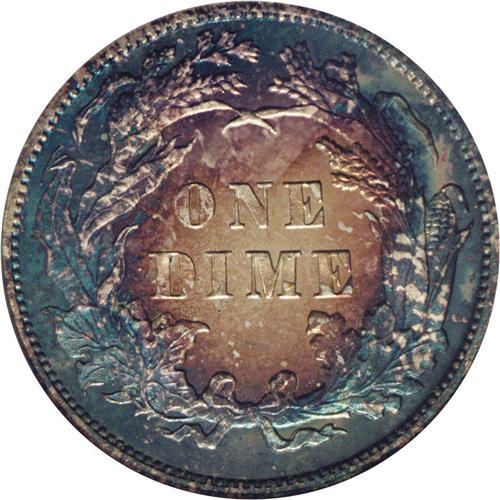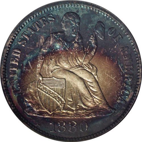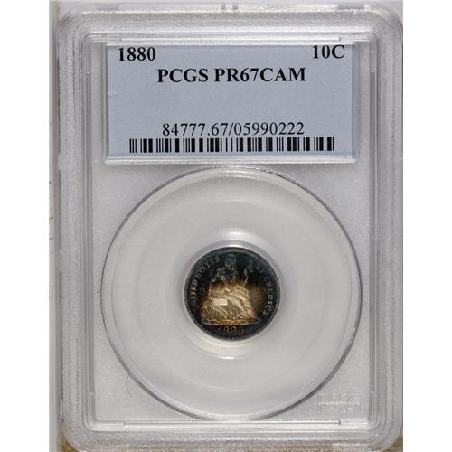 <B>1880 10C PR67 Cameo PCGS.</B></I> Magnificently toned in rich aquamarine and violet shades, leaving an elliptical opening of brilliance on the obverse. Demand for proofs from this year has always been influenced by the date's low total mintage. Population: 6 in 67, 0 finer (12/06).<BR><BR><b>Shipping:</b> Coin/Currency (<a target="_blank" href="http://www.heritageauctions.com/common/shipping.php">view shipping information</a>)