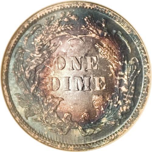 <B>1880<10C> PR67 NGC.</B></I> Only 36,000 business strikes were produced in this year, and proofs are much more available for the date collector. Spectacularly toned in concentric shades of cobalt-blue, purple-rose, and golden-brown, that lighten to near-brilliance in the centers. A great-looking, original Superb Gem from this low total mintage year. Housed in an early NGC holder. Census: 10 in 67, 4 finer (6/06).
