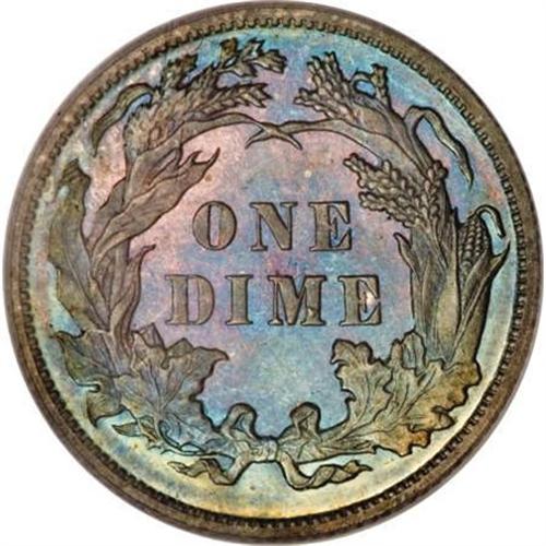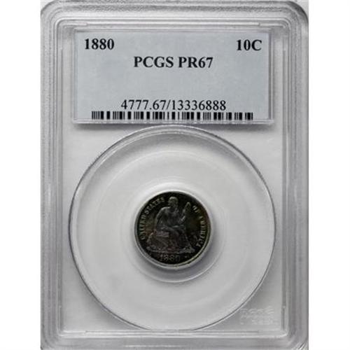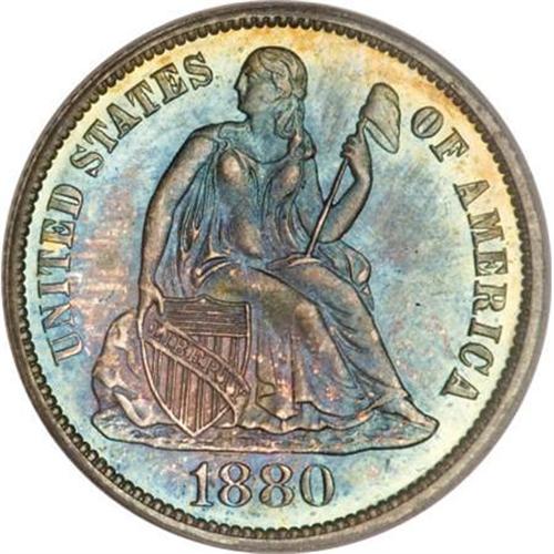<B>1880 10C PR67 PCGS.</B></I> Deeply toned in sea green, indigo, and violet shades, this dime generates an unusual degree of eye appeal. The surfaces remain fully reflective despite the heavy patina, with no distracting marks. A better date as a circulation strike and therefore under demand from date collectors.<BR><BR><B>Coin Engraver:</B> Christian Gobrecht<BR><BR><b>Shipping:</b> Coins & Currency (<a target="_blank" href="http://www.heritageauctions.com/common/shipping.php">view shipping information</a>)