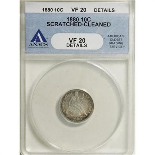 <B>1880 10C --Cleaned, Scratched--ANACS. VF20 Details.</B></I> NGC Census: (1/116). PCGS Population (0/124). Mintage: 36,000. Numismedia Wsl. Price for NGC/PCGS coin in VF20: $246. (#4688)<BR><BR><B>Coin Engraver:</B> Christian Gobrecht<BR><BR><b>Shipping:</b> Coins & Currency (<a target="_blank" href="http://www.heritageauctions.com/common/shipping.php">view shipping information</a>)