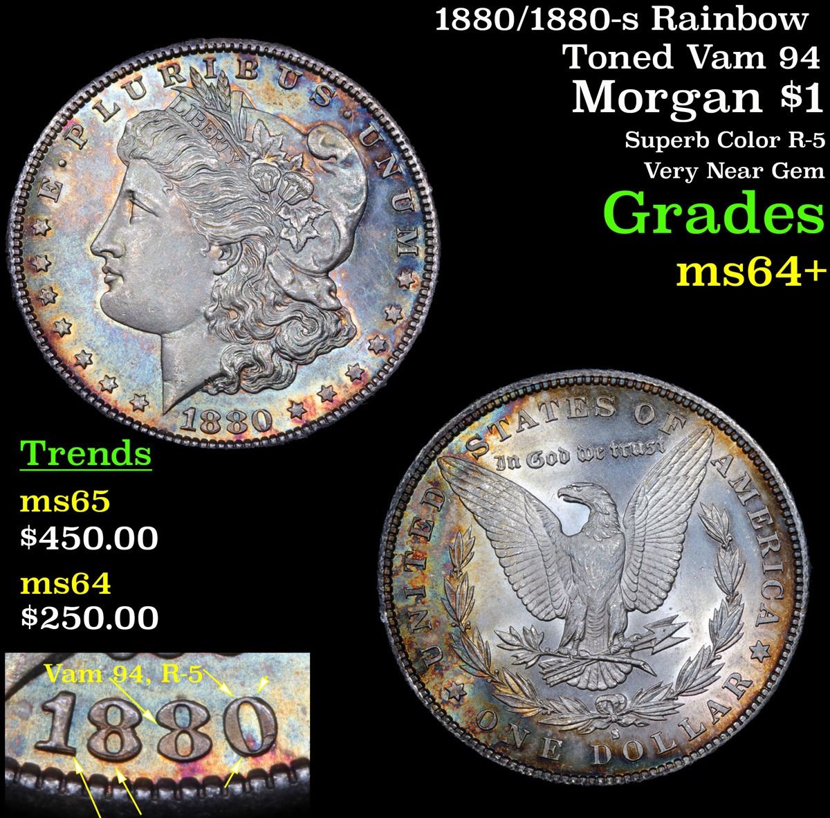 1880/1880-s Rainbow Toned Vam 94 Superb Color R-5 Very Near Gem Morgan Dollar $1 Grades Choice+ Unc. A Corey's Pick