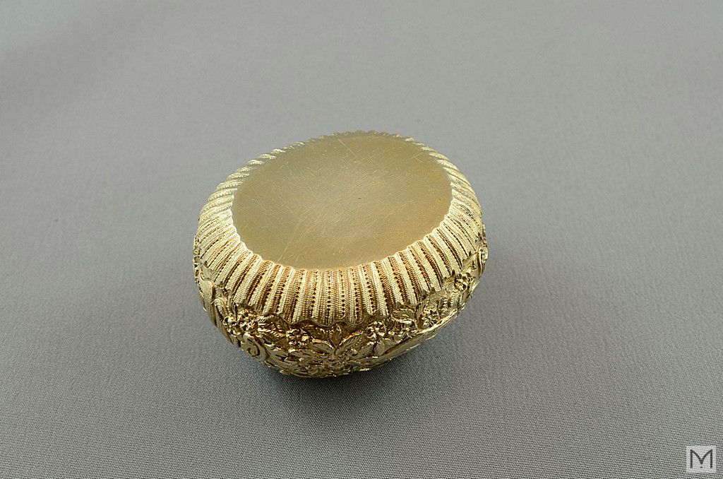 Very fine antique condition. There are some expected very minor surface scratches - mostly on base (from intended use). The hinged lid closes tightly/securely and operates smoothly. There is no monogram. There is a small 'v' shaped notch evident on inner lip (shown in images).