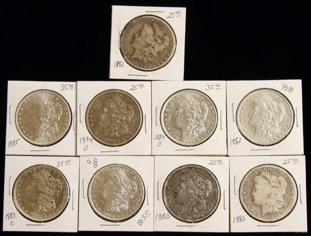 1880-1885 US Liberty Head Silver Dollars 9 coins in total, various years, mints, and conditions. All