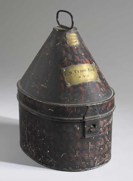A fine and scarce example of an 1878 pattern officer's home service Army Veterinary Department helmet with fitted case made by H. Lehmann Military Outfitters, Aldershot. On the front of the helmet is a crowned star pattern helmet plate, the centre with silver "AVD" monogram on a black leather background. Brass name plate mounted on tin case inscribed "G. W. Tyson Esqre. A.V.D." The all Officer Army Veterinary Department was formed in 1880 and existed until March 1906 when it was amalgamated with the other ranks of the Army Veterinary Corps. A small and short lived unit making items of this type