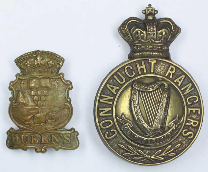 Badges including, Carlow Rifles, Connaught Rangers, Leinster Regiment, South Irish Horse, Royal Irish Regiment, Royal Munster Fusiliers, North Irish Horse, Royal Ulster Rifles, Inniskilling Dragoons, Royal Inniskilling Fusiliers, Ulster Defence Regiment, Royal Irish Fusiliers, Queen's University OTC, Irish Guards etc. Includes some reproductions. (35 items)