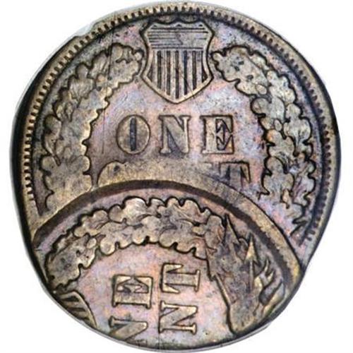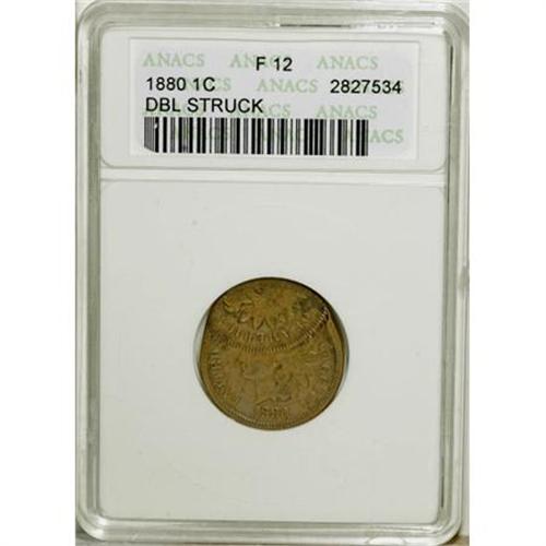 <B>1880 1C Indian Cent--Double Struck--Fine 12 ANACS.</B></I> The second strike is 55% off center toward 9 o'clock, at 12 o'clock relative to the first strike. Glossy medium brown with subtle ice-blue and ruby highlights. A few faint marks are noted on the first strike above ONE. Many individuals must have pondered this example before somebody finally removed it from circulation.<BR><BR><B>Coin Engraver:</B> James B. Longacre<BR><BR><b>Shipping:</b> Coins & Currency (<a target="_blank" href="http://www.heritageauctions.com/common/shipping.php">view shipping information</a>)