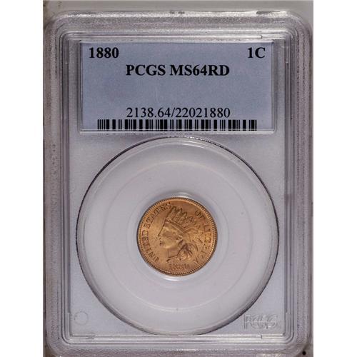 <B>1880<1C> MS64 Red PCGS.</B></I> A lovely, well struck orange-red near-Gem that has a few faint marks on the cheek and scattered obverse flyspecks. The reverse is nearly perfect. The top of the second 8 is defective, as made.