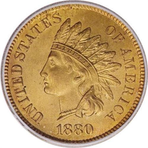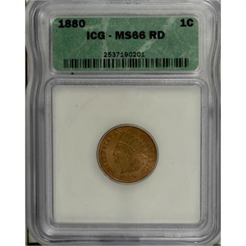 <B>1880 1C MS66 Red ICG.</B></I> Satiny and especially bold, with glimpses of orange patina framing otherwise golden-tan surfaces. A few flecks of obverse carbon can be detected under close inspection, certainly not enough to negatively influence either the grade or the color rating of this high quality 1880 Indian.<BR><I>From The Santa Fe Collection.</B></I><BR><BR><B>Coin Engraver:</B> James B. Longacre<BR><BR><b>Shipping:</b> Coins & Currency (<a target="_blank" href="http://www.heritageauctions.com/common/shipping.php">view shipping information</a>\)