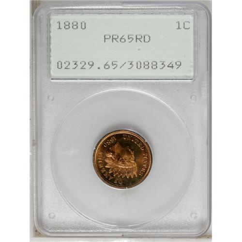 <B>1880<1C> PR65 Red PCGS.</B></I> A vivid Gem with moderate to deep mirrors and vibrant orange-copper surfaces that have patches of magenta. Housed in an early holder.