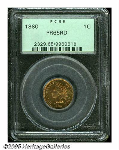 <B>1880<1C> PR65 Red PCGS.</B></I> Light golden-red color with pinpoint sharpness to the devices and a touch of contrast with the mildly reflective fields. A minor pin scratch is noted near the upper right rim for accuracy.