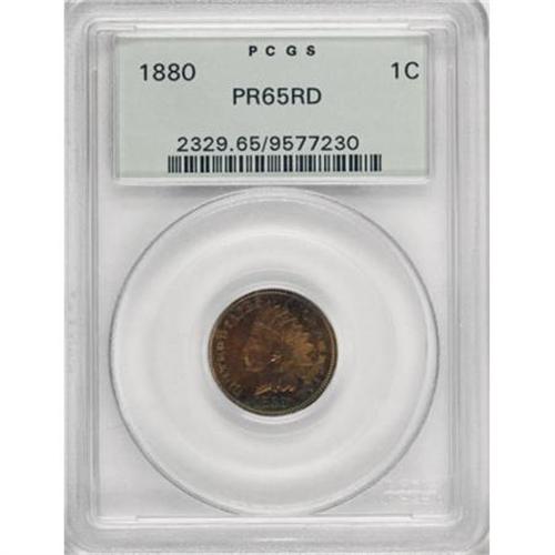 <B>1880 1C PR65 Red PCGS.</B></I> Predominantly olive-gold, although the central reverse is rich cherry-red. A needle-sharp and unblemished representative. Housed in a green label holder, and surprisingly scarce in full red. Population: 61 in 65 Red, 25 finer (10/07).<BR><BR><B>Coin Engraver:</B> James B. Longacre<BR><BR><b>Shipping:</b> Coins & Currency (<a target="_blank" href="http://www.heritageauctions.com/common/shipping.php">view shipping information</a>)
