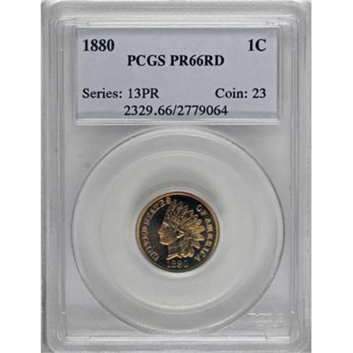 <B>1880 1C PR66 Red PCGS.</B></I> The surfaces of this lovely Premium Gem proof are predominantly yellow-orange with blushes of rose at the upper obverse and lower reverse. Boldly impressed and gleaming with a tiny planchet flaw on the cheek. An attractive example of this mid-date issue. Population: 16 in 66 Red, 9 finer (8/07).<BR><BR><B>Coin Engraver:</B> James B. Longacre<BR><BR><b>Shipping:</b> Coins & Currency (<a target="_blank" href="http://www.heritageauctions.com/common/shipping.php">view shipping information</a>)