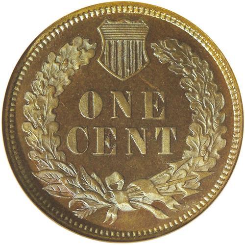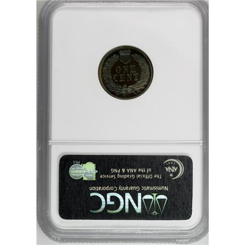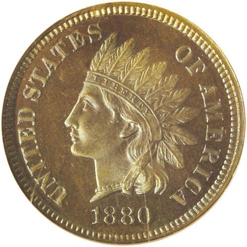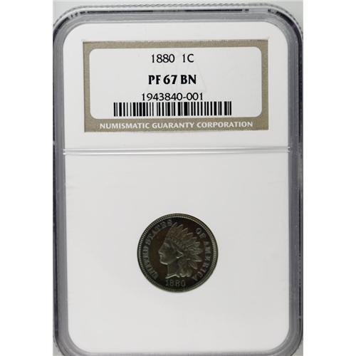 <B>1880<1C> PR67 Brown NGC.</B></I> How ironic that such a coin can be called "brown," because this is one for the color enthusiasts, with reflective, deeply mirrored iridescent greenish-blue fields on each side that serve to highlight the razor-sharp strike and pristine condition. More and more Indian cent enthusiasts are turning to such coins as an alternative to the pricey, often-unattainable Red coins. Bowers' Indian cent reference comments, "High-quality pieces with rich brown-toned surfaces, often with a nuance of iridescent blue (especially when viewed at a certain angle to the light), are from long-term hoards that passed into dealers' hands. Same comment for other issues of 1880s and some of the 1890s, until the Mint began reducing the mintage quantities." The finest and only PR67 within this color designation at either service.