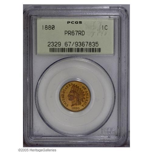 <B>1880<1C> PR67 Red PCGS.</B></I> Light peach color is complemented with hints of ruby color on the central obverse. The fields are immaculate, and the cheek has only faint contact. The 1 in the date is lightly repunched on the base and serif. Housed in an old green label PCGS holder.