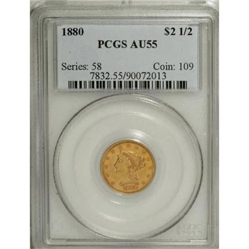 <B>1880 $2 1/2 AU55 PCGS.</B></I> PCGS Population (12/39). NGC Census: (14/85). Mintage: 2,996. Numismedia Wsl. Price for NGC/PCGS coin in AU55: $665. (#7832)<BR><BR><B>Coin Engraver:</B> Christian Gobrecht<BR><BR><b>Shipping:</b> Coins & Currency (<a target="_blank" href="http://www.heritageauctions.com/common/shipping.php">view shipping information</a>\)