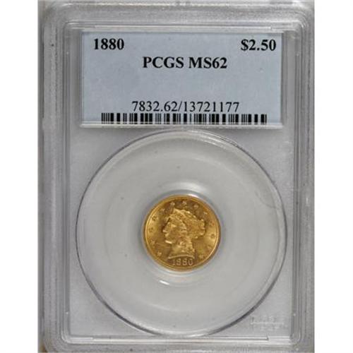 <B>1880 $2 1/2 MS62 PCGS.</B></I> A mix of peach-gold and mint-green patina rests on the lustrous surfaces of this MS62 quarter eagle. Excellent definition is seen on the design elements, that are highlighted by partially prooflike fields. A few minute marks are scattered about. Population: 9 in 62, 17 finer (8/07).<BR><BR><B>Coin Engraver:</B> Christian Gobrecht<BR><BR><b>Shipping:</b> Coins & Currency (<a target="_blank" href="http://www.heritageauctions.com/common/shipping.php">view shipping information</a>)