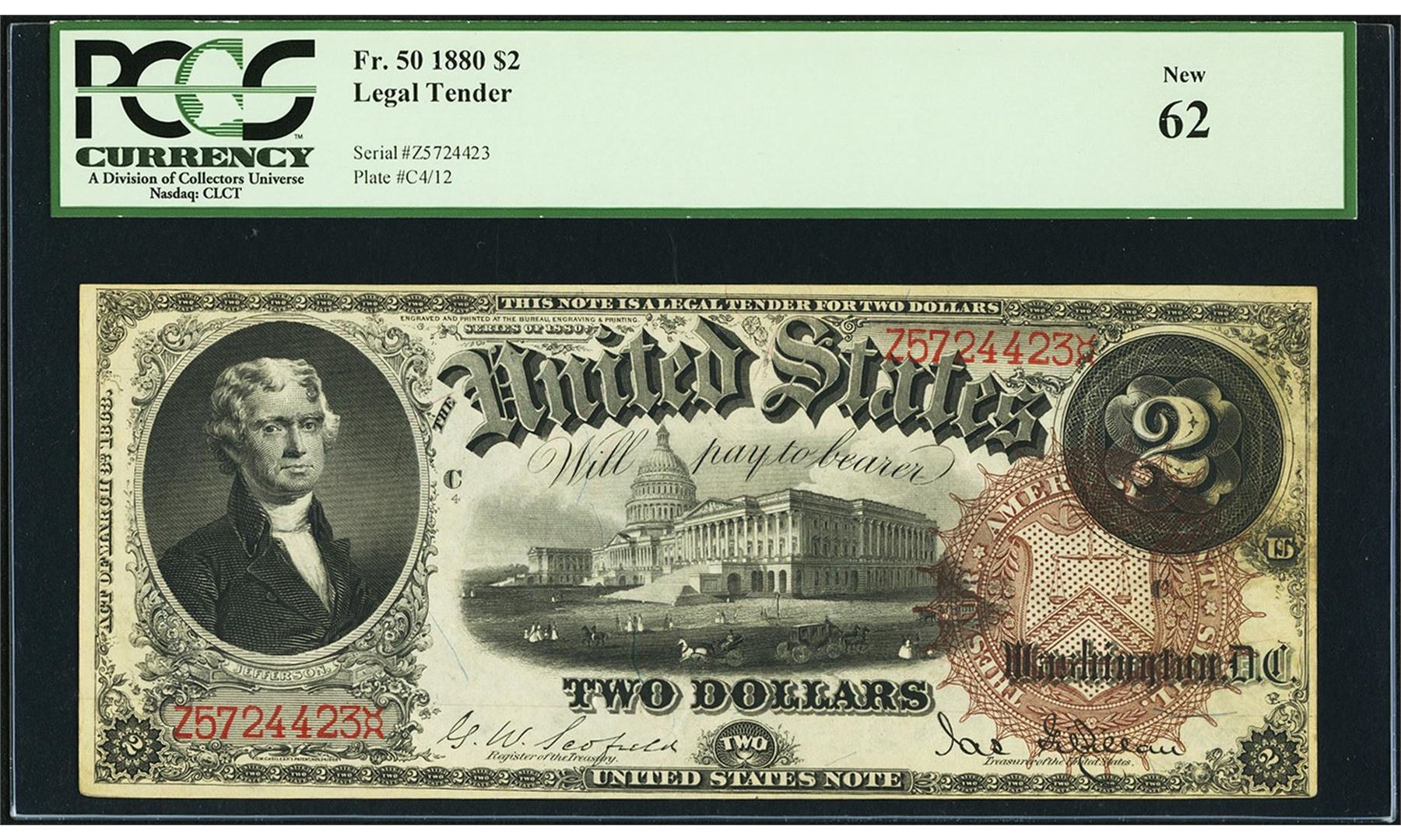 One 1880 $2 Legal Tender Note Fr.50 PCGS New 62. PCGS Graded.